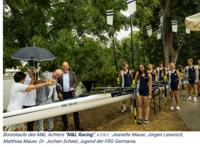 Bei etwas wechselhaftem Wetter traf sich die M&L Gemeinschaft am Samstag, 15. Juli 2023 am neuem Jugend- und Schulruderzentrum Grunelius Bootshaus in Niederrad, um das 30 jährige Jubiläum der M&L AG zu feiern. Zu den Gästen gehörten neben der Jungend und der Honoratioren der Germania auch Partner, Kunden, Freunde und Mitarbeiter der M&L AG mit ihren Familien. Stadtrat Claus Möbius überbrachte Gruß- und Dankesworte der Stadt Frankfurt. Ein buntes Programm, das von der Germania Jugend tatkräftig unterstützt wurde, führte die Gemeinschaft durch den Tag, brachte den anwesenden Gästen den Rudersport näher und vertiefte die freundschaftliche Zusammenarbeit mit der FRG Germania. Neben der Bootstaufe und Jungfernfahrt des neuen M&L Achters "M&L Racing", gab es die Möglichkeit für die Gäste eine Bootsfahrt mit dem Kirchboot zu machen oder an den Ergometern der Germania das Trocken-Training kennen zu lernen. Symbolisch für die langfristig ausgelegte Zusammenarbeit wurde auch ein Ginkgo-Baum auf dem Gelände gepflanzt. Verschiedene Spiele und kulinarische Köstlichkeiten boten Spaß und Unterhaltung für Groß und Klein.