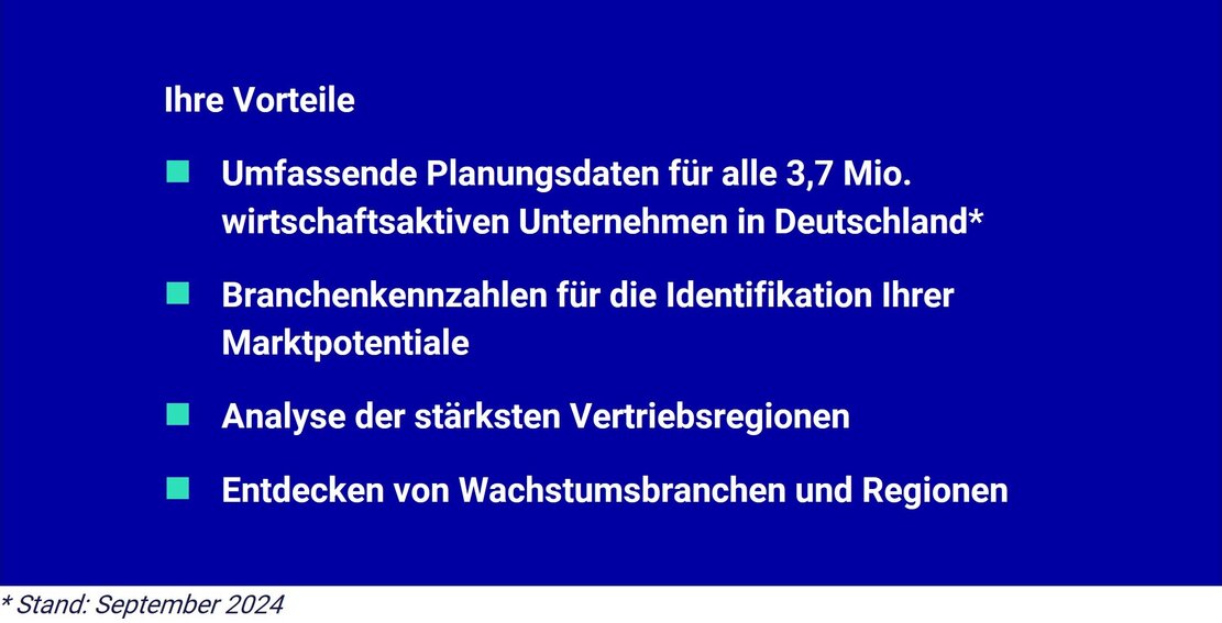 Wir verlosen 5x umfassende Planungsdaten-Pakete Ihrer Wahl mit allen 3,7 Millionen wirtschaftsaktiven Unternehmen aus Deutschland für Ihre zielgerichtete Unternehmens- und Vertriebsplanung.