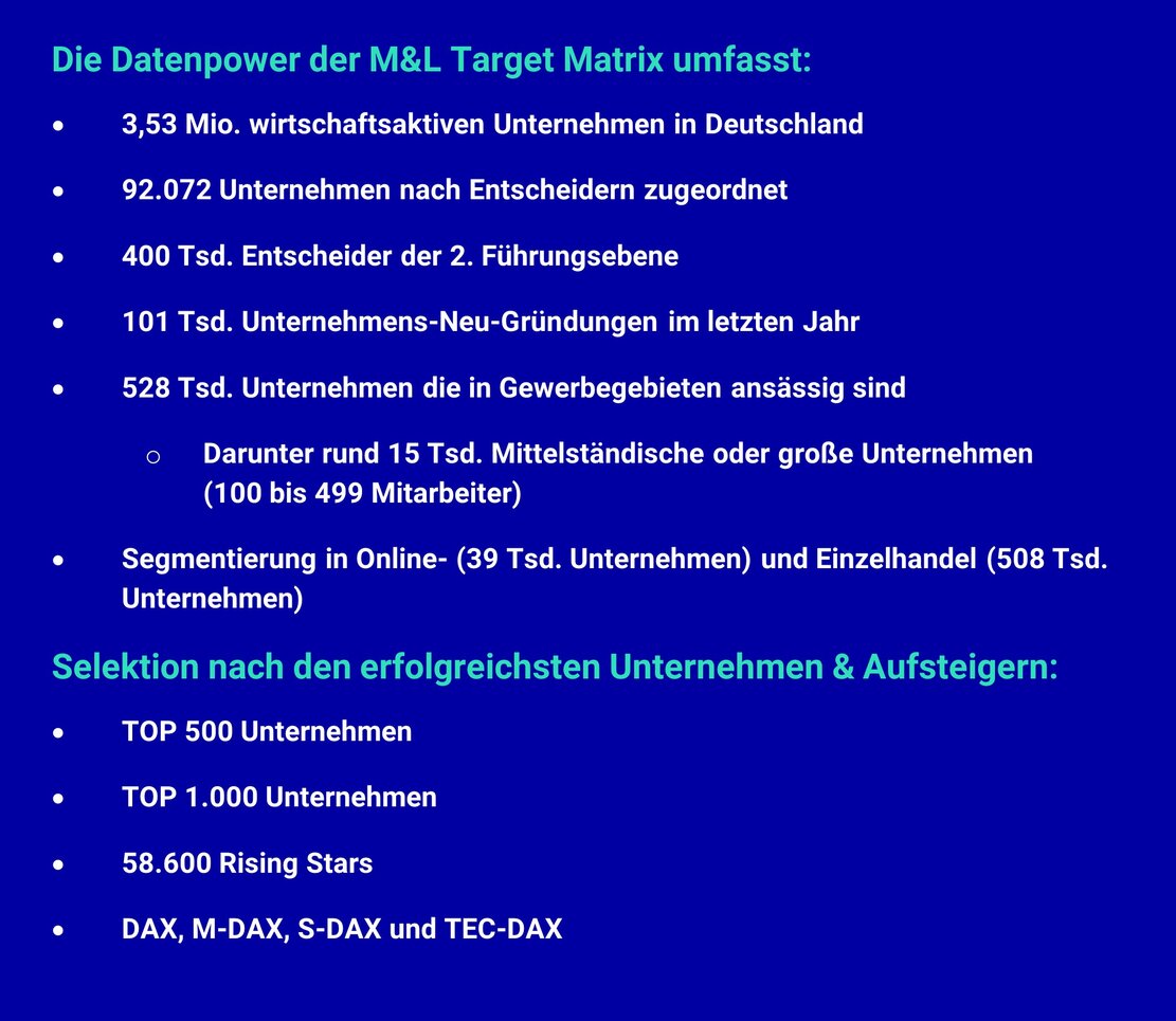 Historisch gewachsene Kundenbeziehungen müssen auf ihre Zukunftstauglichkeit geprüft und gleichzeitig das Neukundengeschäft angekurbelt werden. Die M&L Target Matrix bietet Ihnen die Möglichkeit rund 3,75 Millionen wirtschaftsaktive Unternehmen in Deutschland zu analysieren.