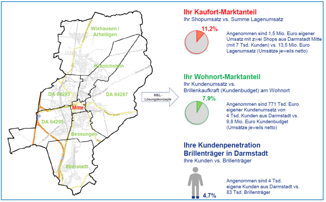 - Wäre Darmstadt Ihr Einzugsgebiet dann hätten Sie von über 155 Tsd. Einwohnern über 83 Tsd. Brillenträger als potenzielle Kunden (das sind 53% der Einwohner. Bei der Berechnung auf der Zielgruppe ab 16 Jahren steigt der Anteil sogar auf über 61%).
