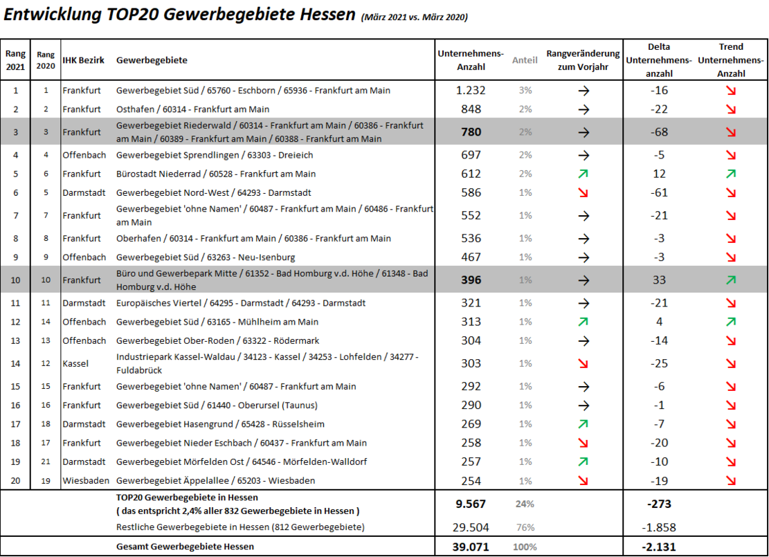 Wie hier am Beispiel der TOP 20 Gebewerbegebiete in Hessen dargestellt, ist es möglich, zu analysieren, welche Marktbereiche in welchem Umfang von der Gesamtentwicklung betroffen sind: